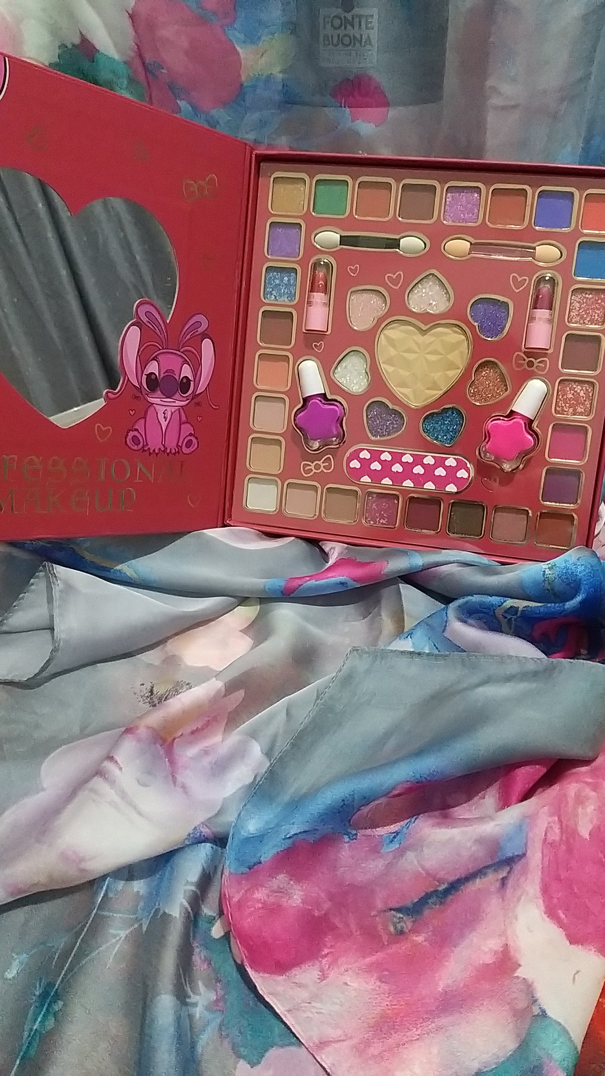 Palette 43 in uno di stitch , comprende 2 smalti, 2 rossetti, 28 ombretti, 1 lima ,1 illuminante , 7 glitter ,2 pennelli.