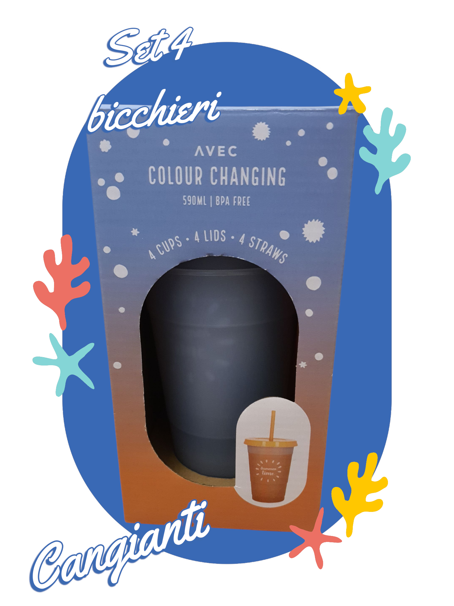 Set 4 bicchieri cangianti . Cambia colore con il ghiaccio , non adatti bevande calde.